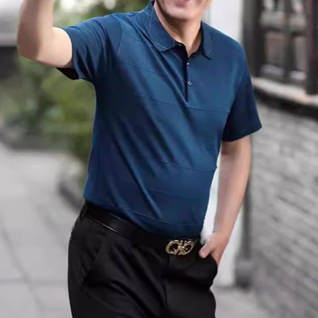 50代メンズのTシャツコーデおすすめ5選において、ボーダー柄ポロシャツは大人の品格を保ちながら着回しやすいおしゃれなアイテムです。