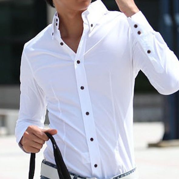 50代メンズのワードローブに欠かせない、清潔感あふれる白のシンプル長袖シャツです。
