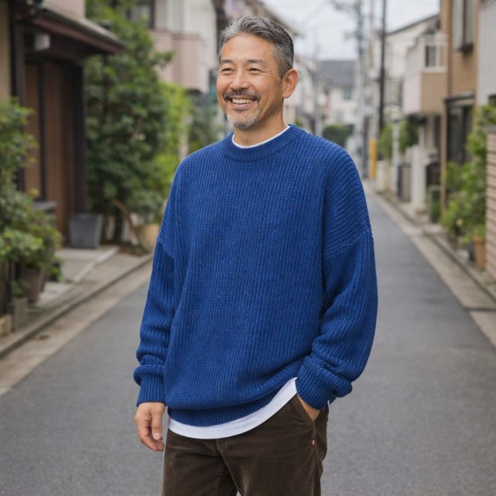 50代メンズファッションに相応しい上品な雰囲気と、トップスとして重ね着もしやすい丈感が魅力です。