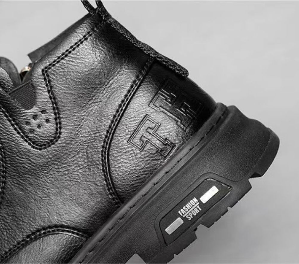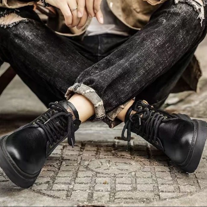 クラシックなワークブーツの無骨さと都会的な洗練さを併せ持つ男性らしい力強い印象