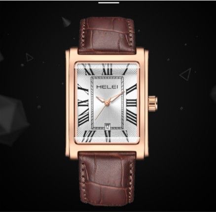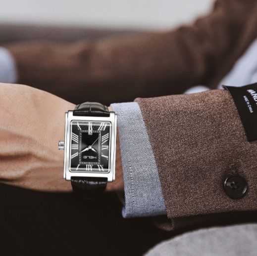 50代メンズファッションにふさわしい、洗練された印象を与える長方形の文字盤が特徴的な腕時計です。