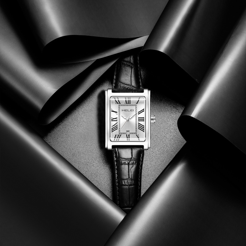 型押しされた革ベルトと角型のケースが織りなす上品なデザインは、袖口から覗く姿も美しく、着用者の洗練されたセンスを引き立てます。