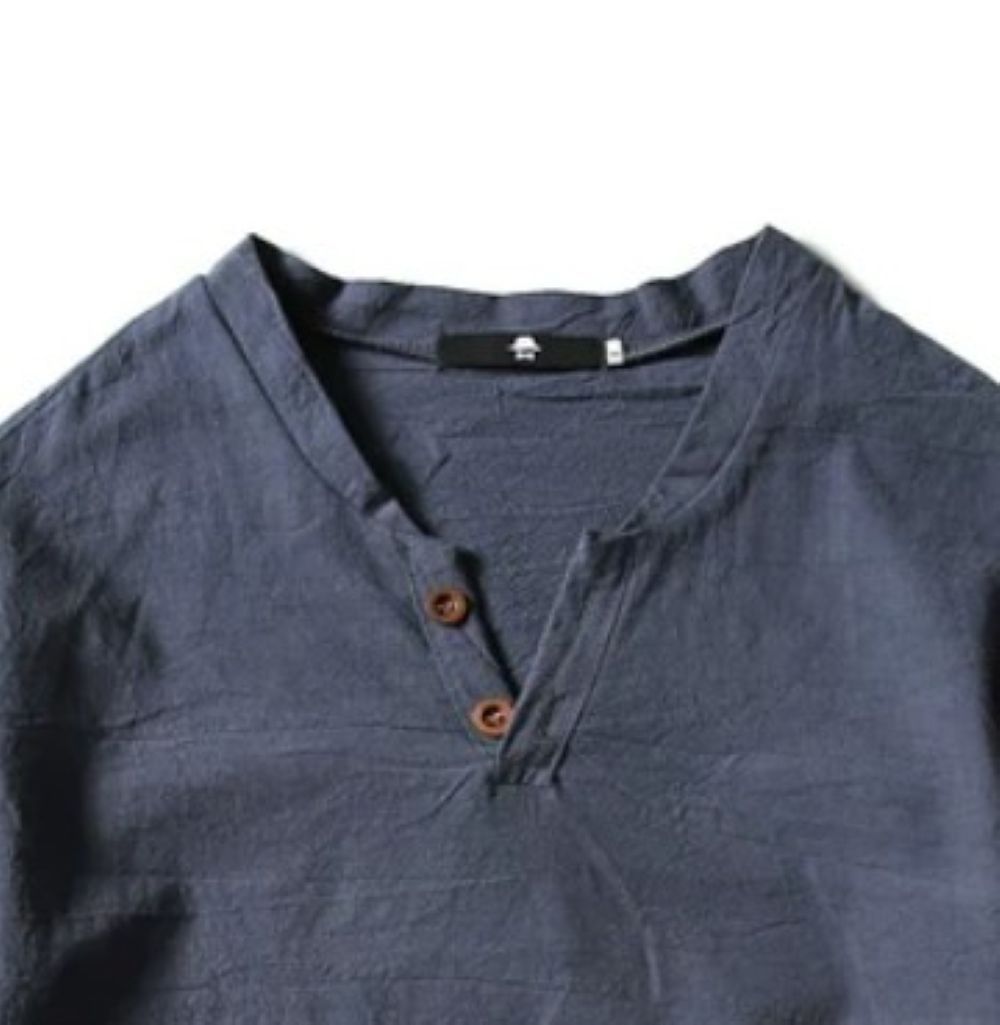 涼しげな天然素材を使用したヘンリーネックTシャツです。