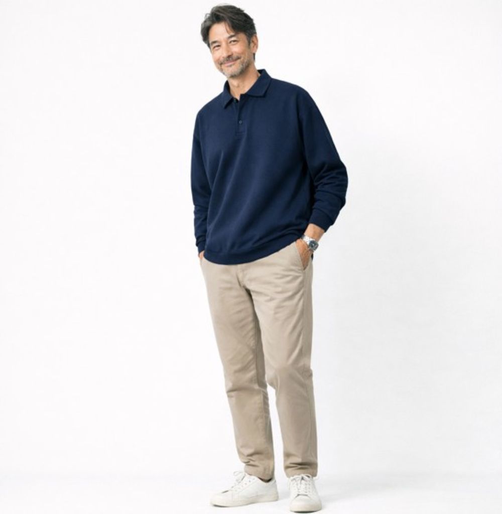50代男性にぴったりの上品な無地長袖ポロシャツ。