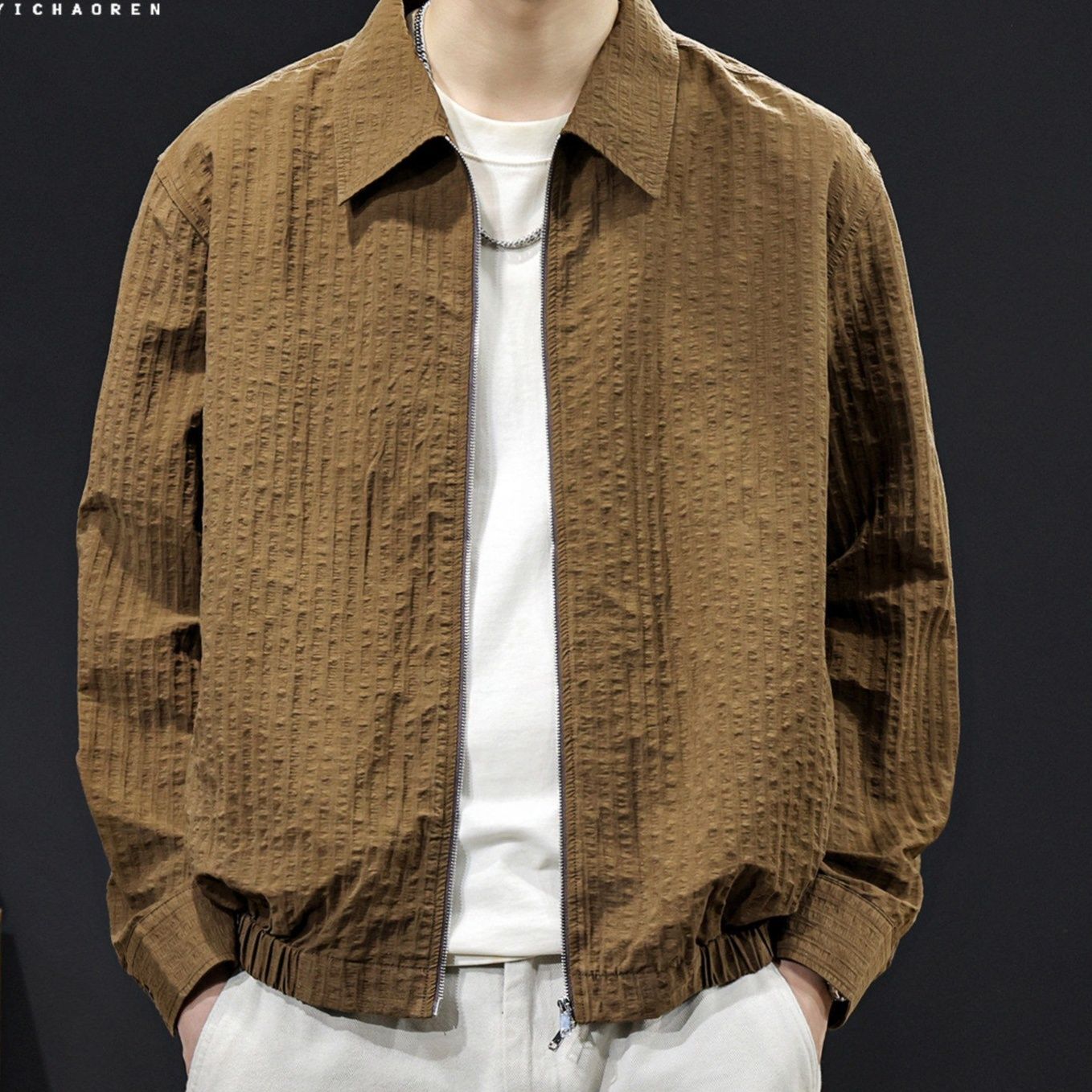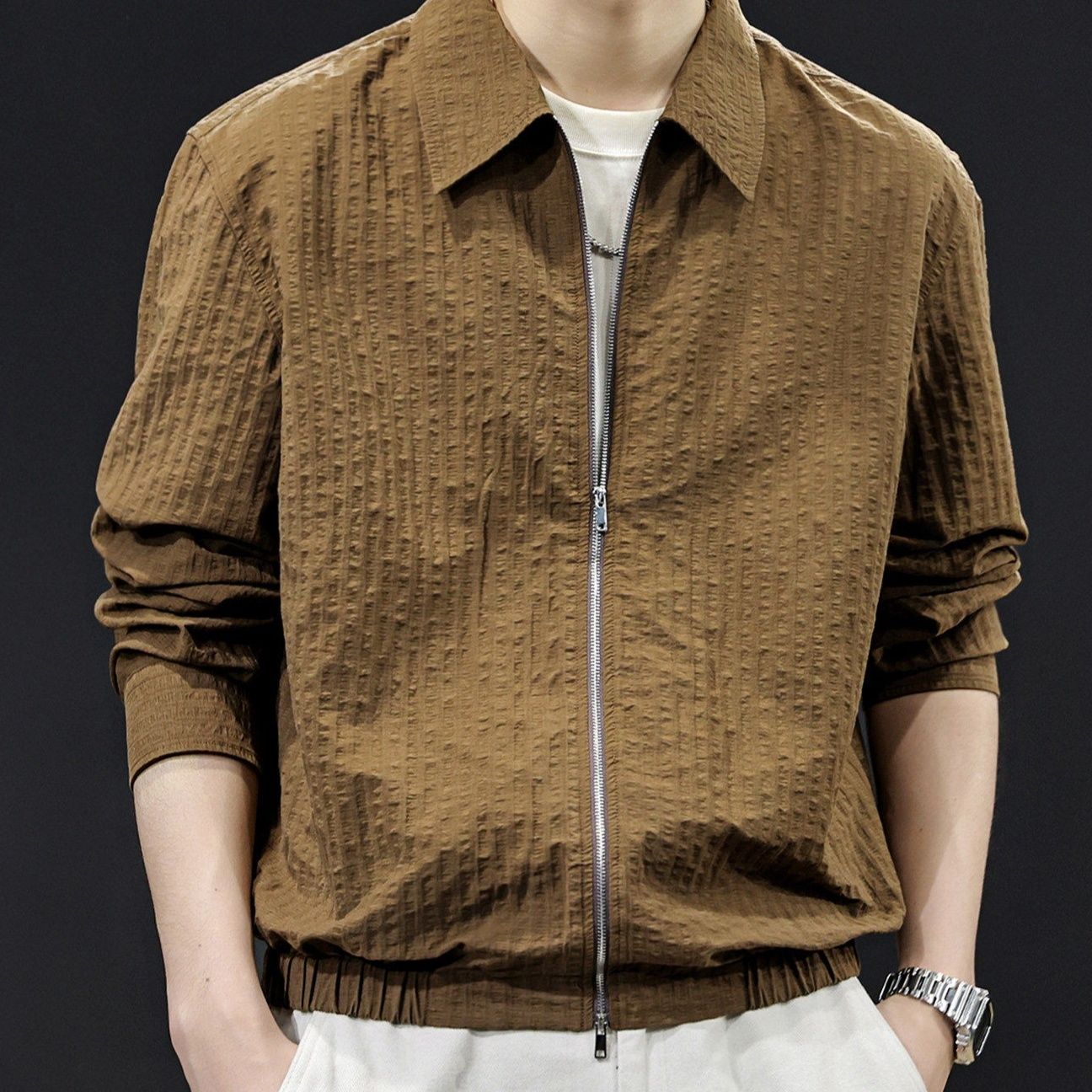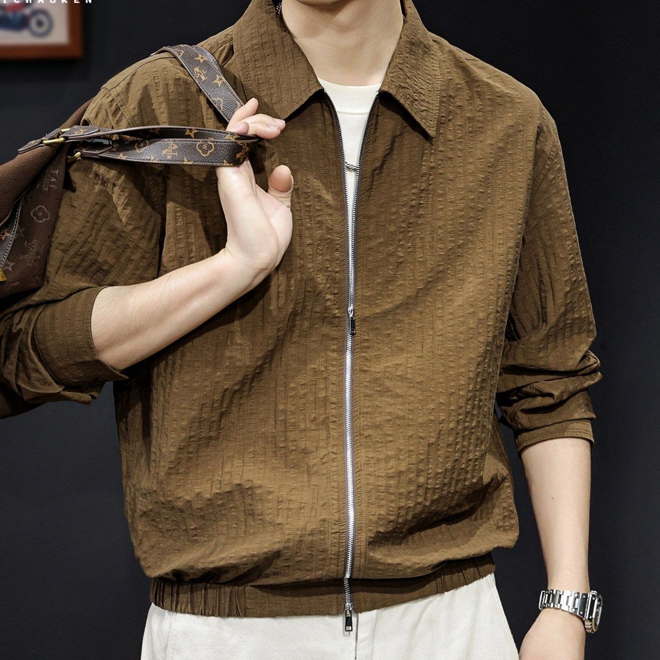 50代メンズファッションに最適な上品な立体織り柄が特徴的なアウターです。