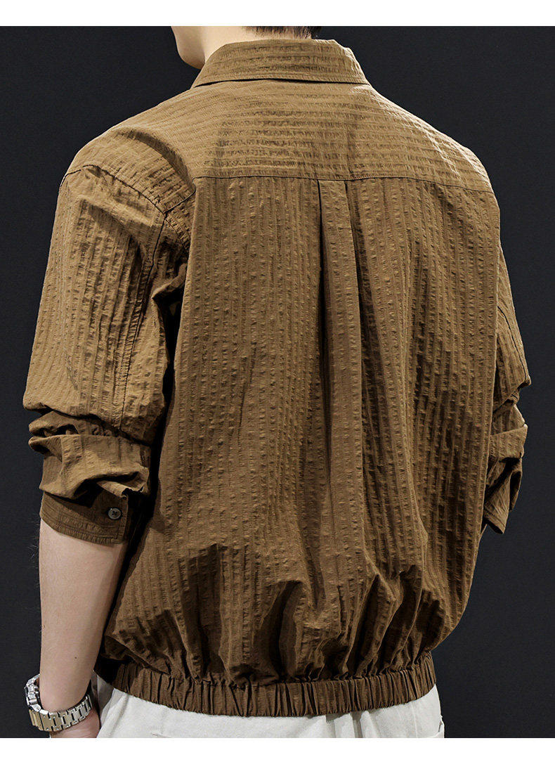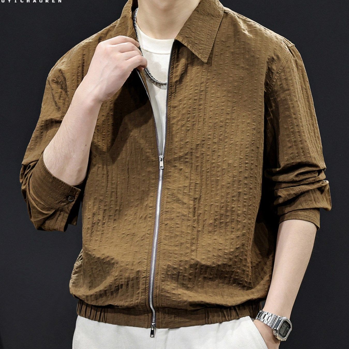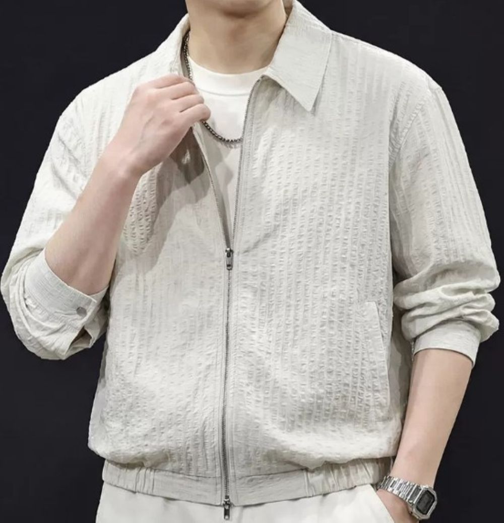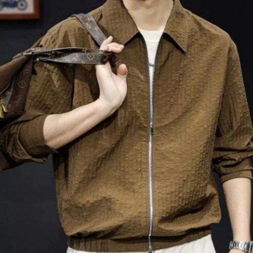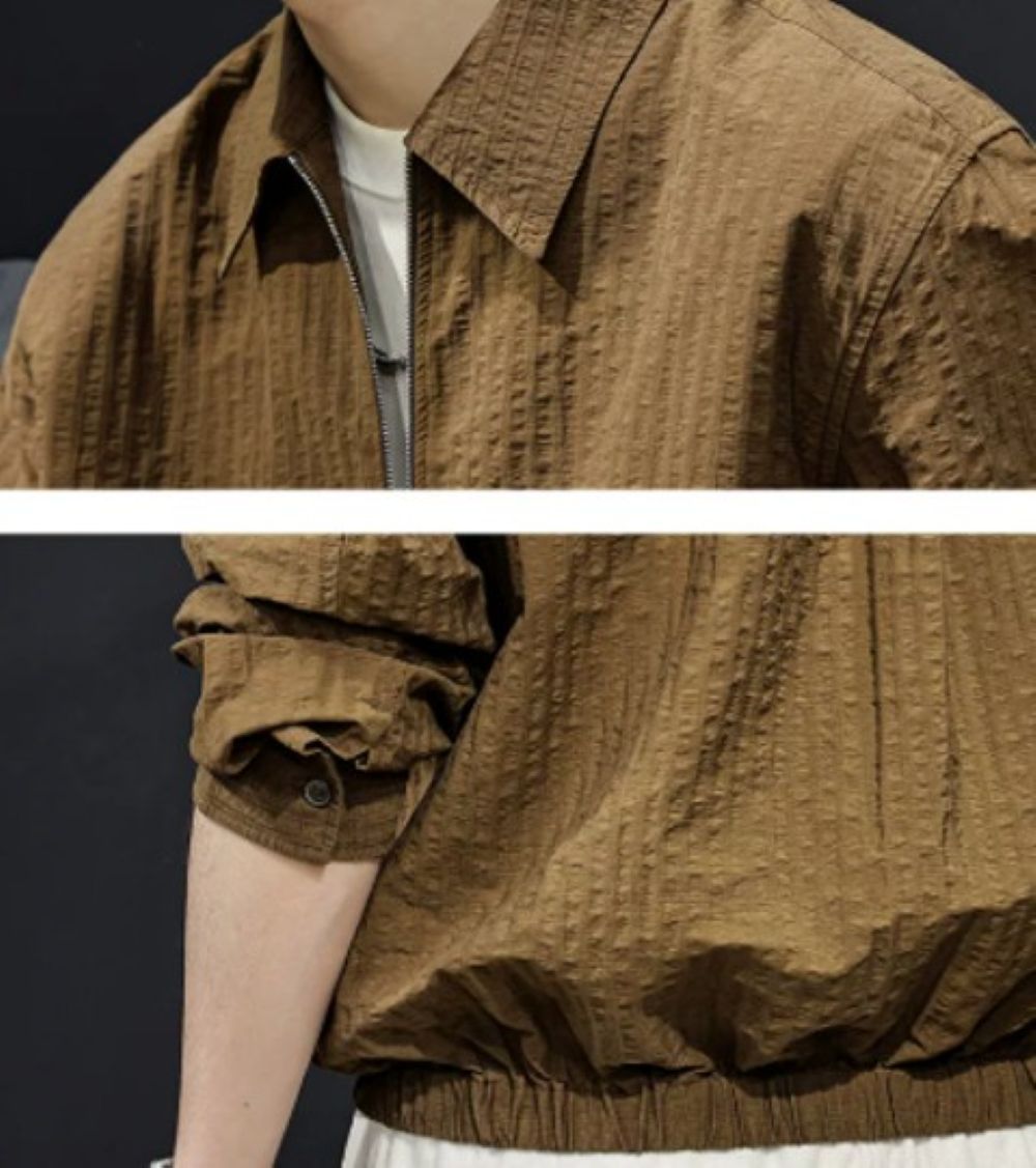 50代メンズファッションに最適な上品な立体織り柄が特徴的なアウターです。